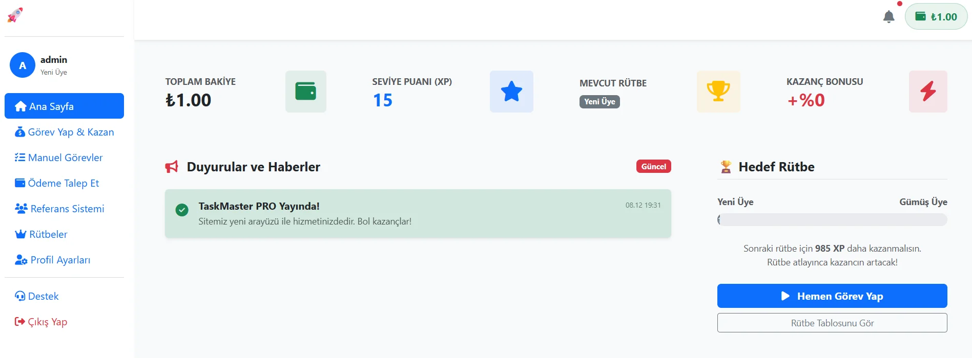 TaskMaster PRO v1.0 – Modern Kazanç Sistemi
